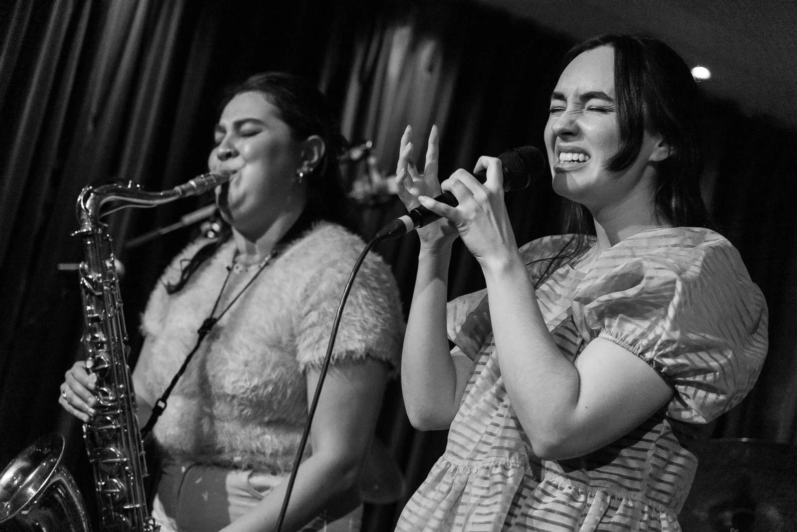 JUNO band members Mona Krogstad playing sax and Malin Dahl Ødegård singing at Club Montmartre. Photo by Frozen Panda.